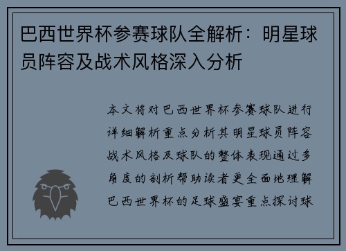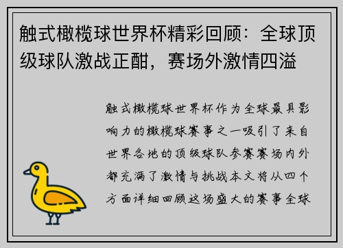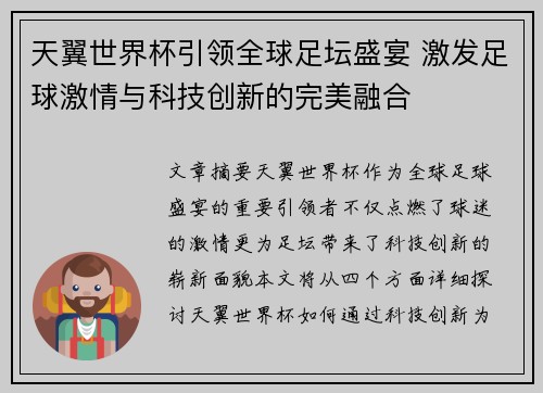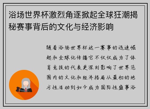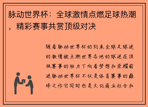 随着世界杯的再次到来,全球无数足球爱好者的目光再次聚焦于这一全球最具影响力的体育赛事。无论是对球员的激情投入,还是对球迷的热血支持,世界杯赛场都充满了无数梦幻般的对决。足球作为全球最受欢迎的运动之一,每四年一度的世界杯无疑是全球最盛大的足球盛宴,吸引着各国顶级球队的角逐。在此背景下,本文将从多个角度探讨“足球盛宴再临激情四射,世界杯赛场聚焦全球梦幻之战”这一主题。首先,我们将通过全球足球发展现状的...